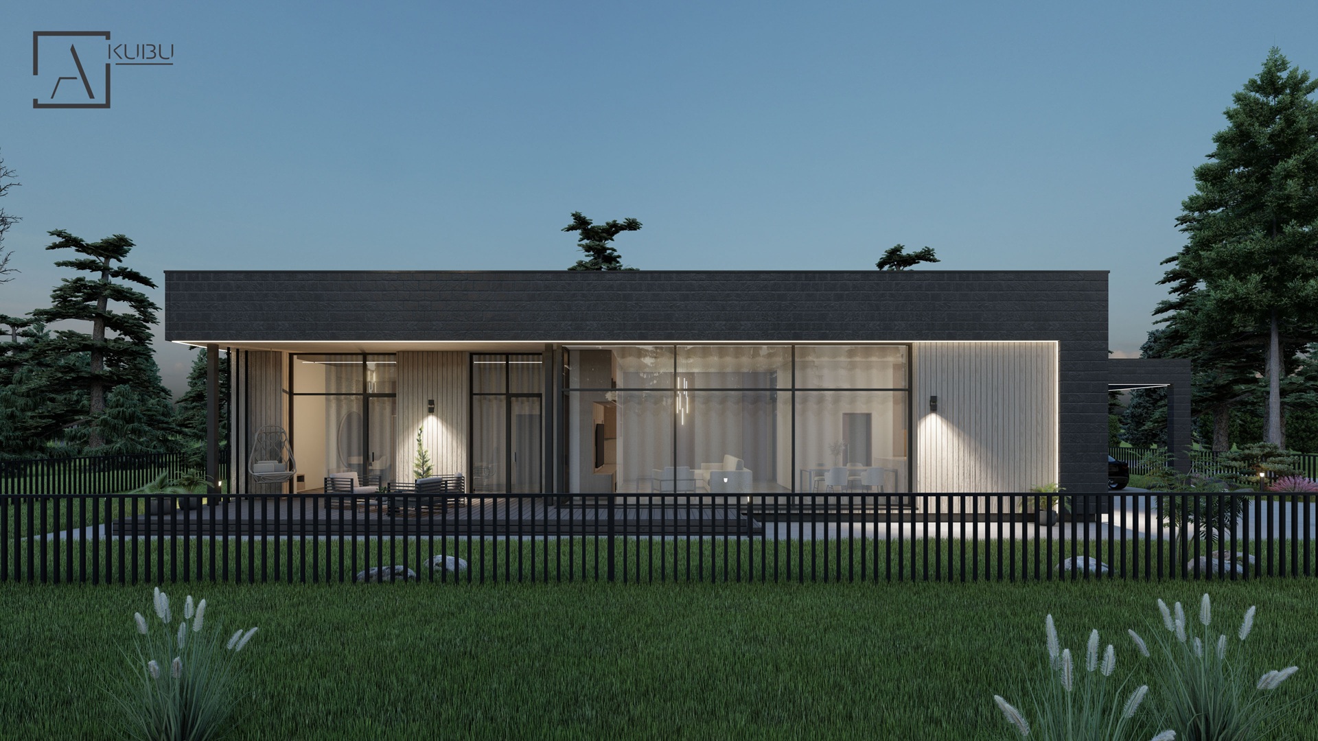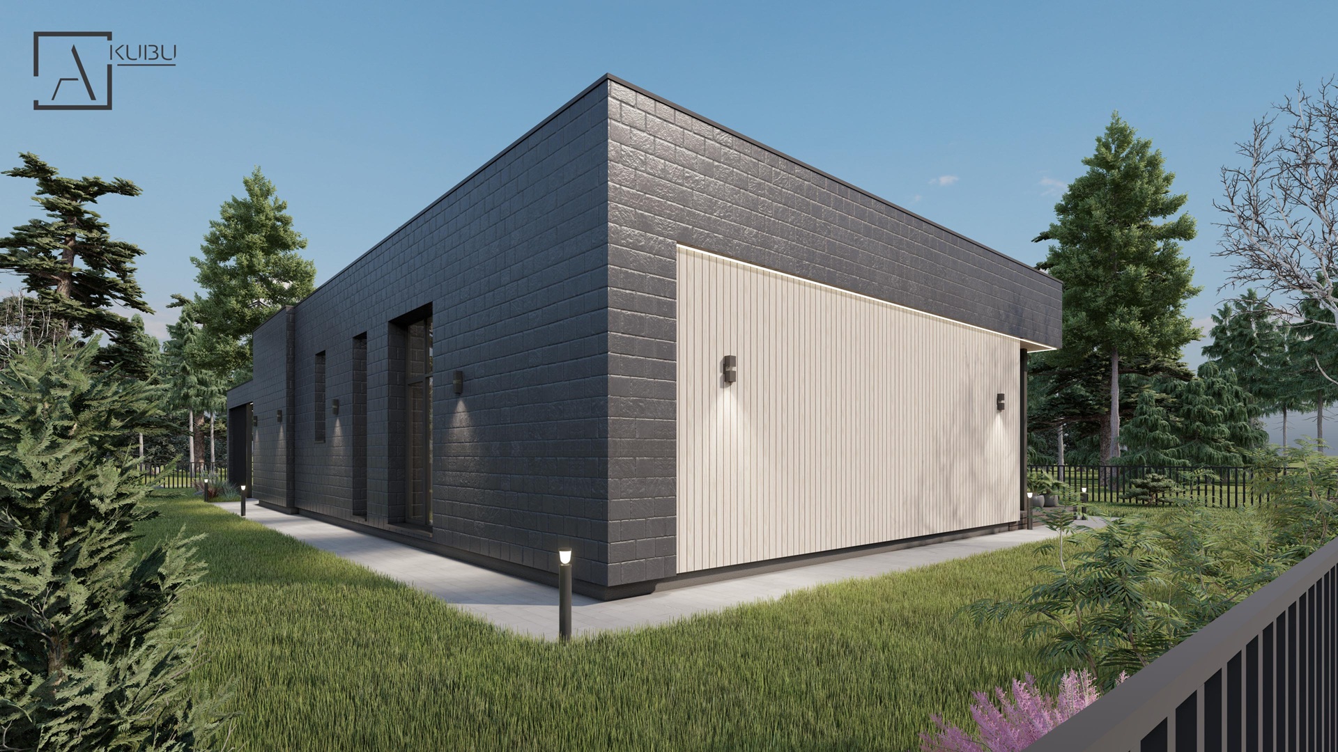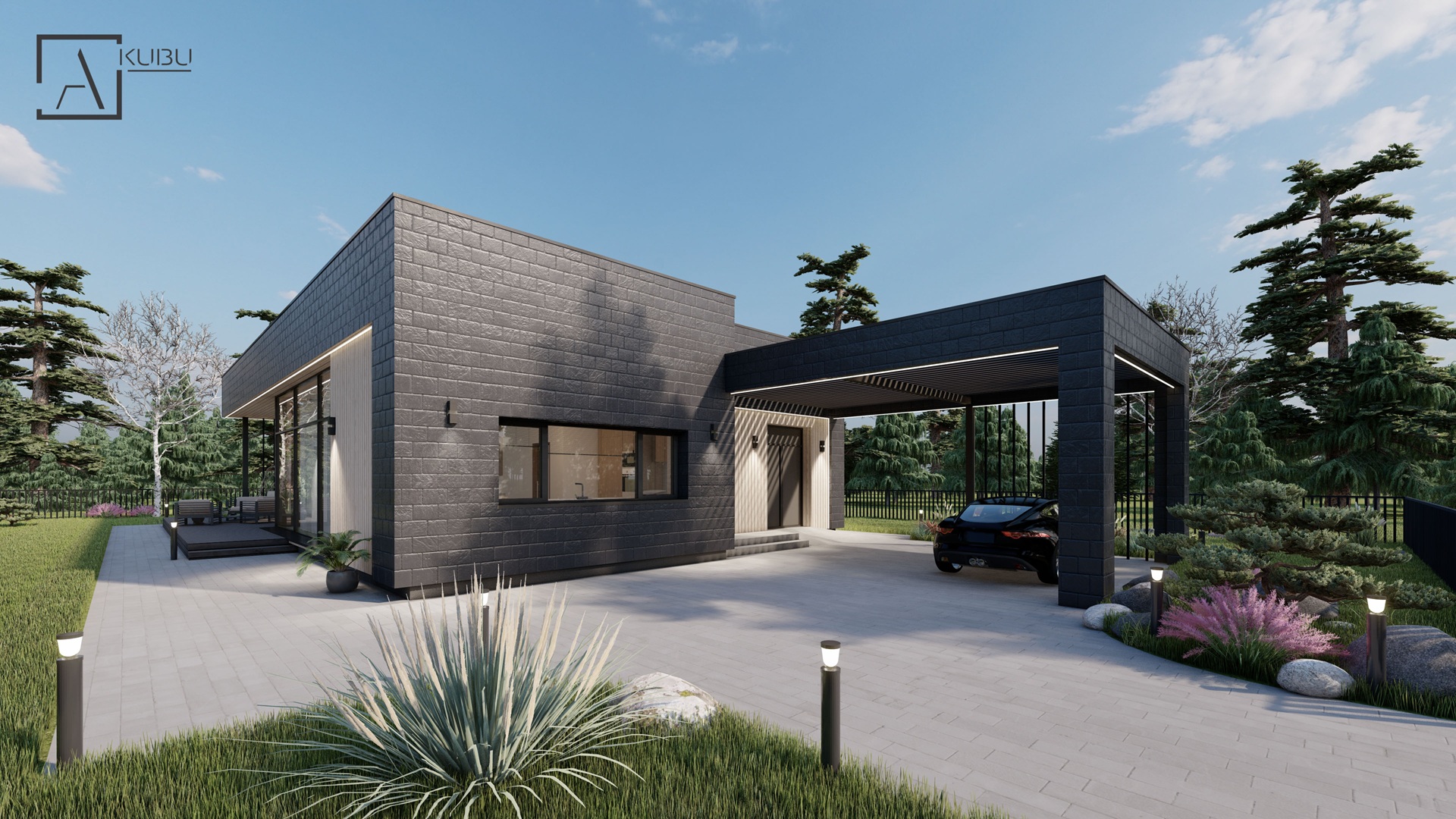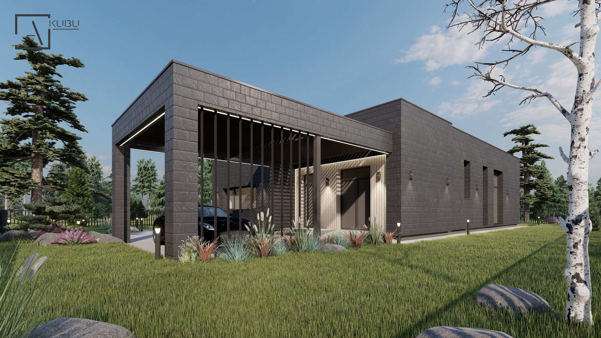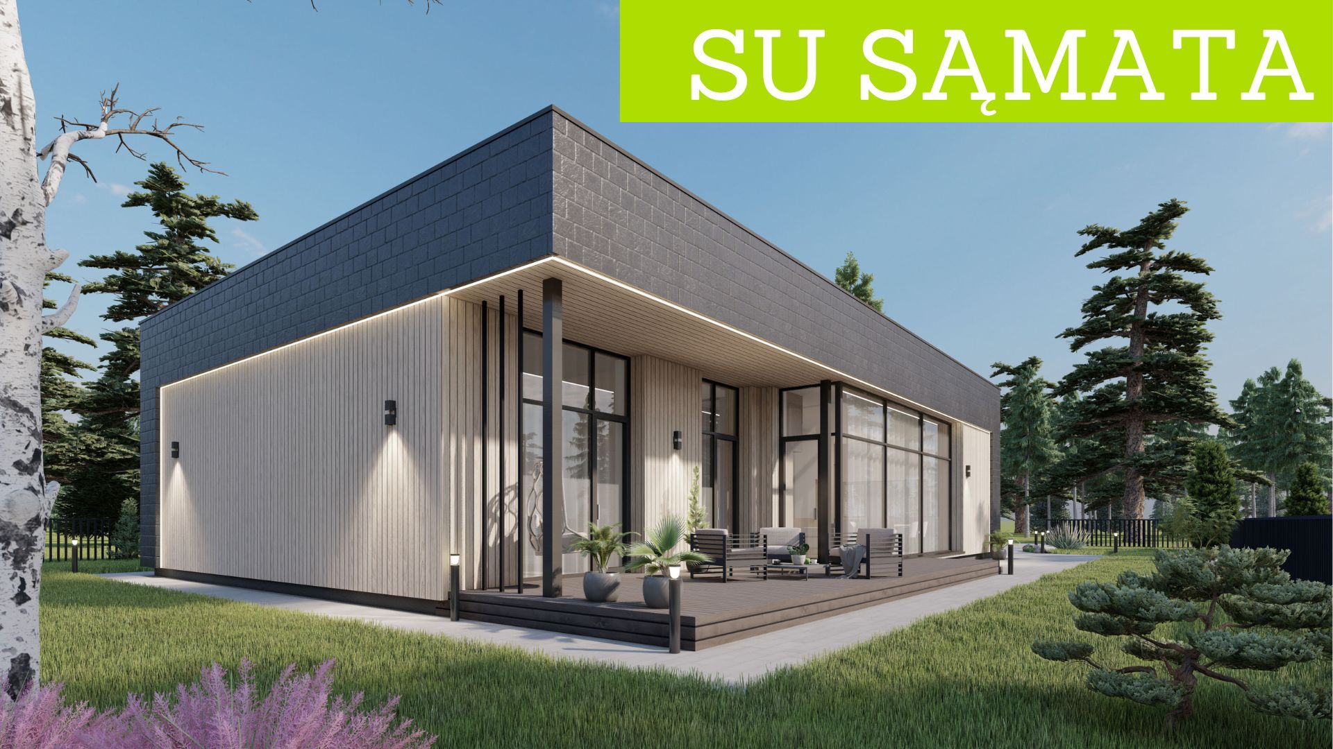 OLIVINAS - modernus vieno aukšto, plokščio stogo 160,5 m² gyvenamasis namas su stogine, dvejais darbo kambariais, erdvia svetaine, jaukia lauko terasa bei stogine automobiliams.
